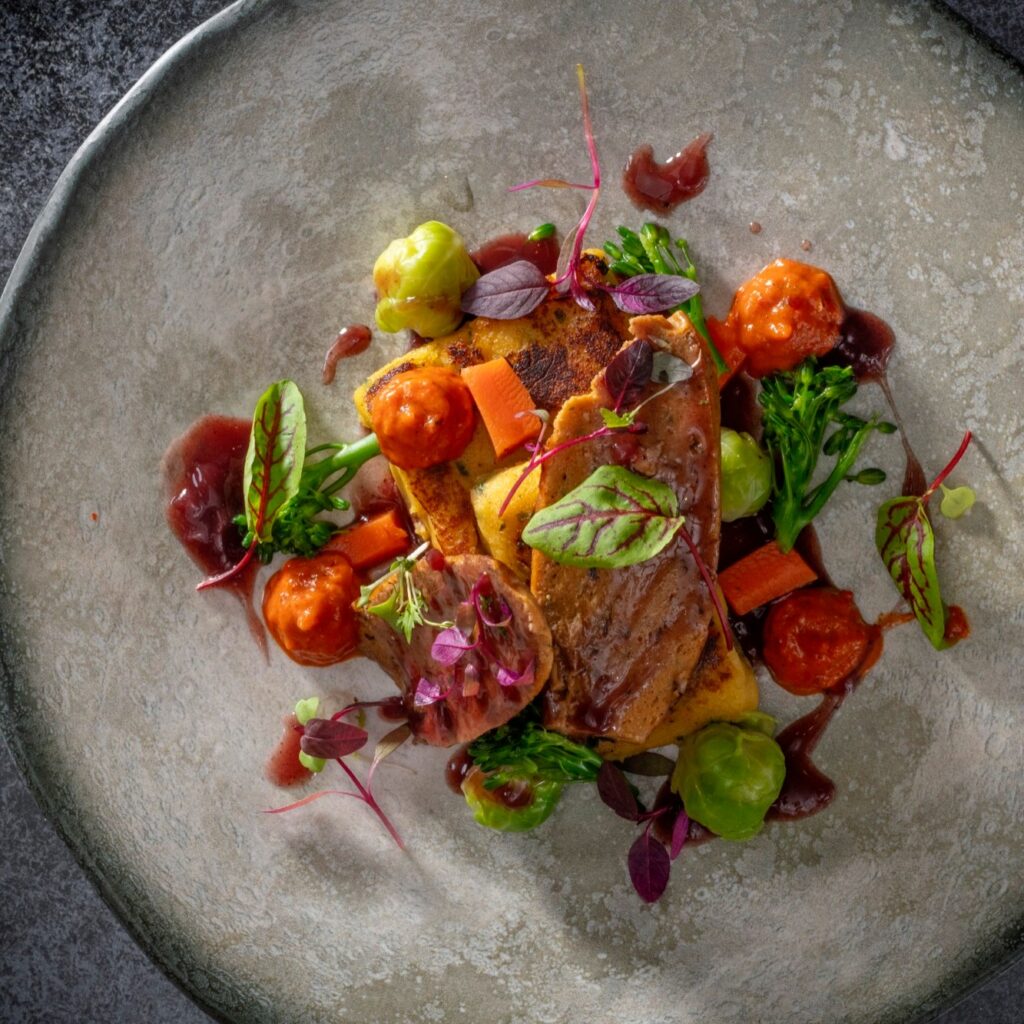Creamed spinach, celeriac & potato gratin, roasted garlic cream, leek nest 18