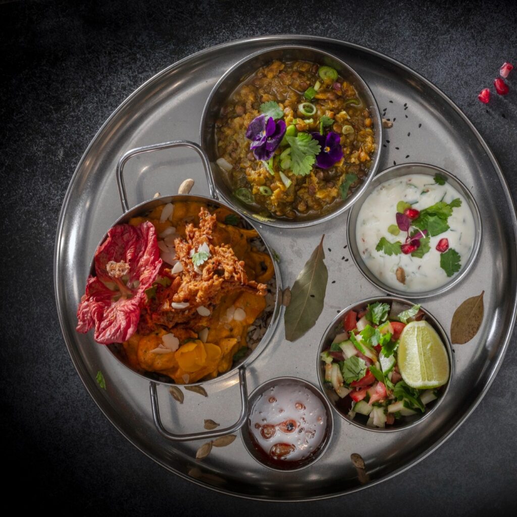 Sweet potato, chickpea & poppy seed korma, cauliflower pakora, cumin rice, chilli flatbread, lime pickle, flaked almonds (GFO) 18.5